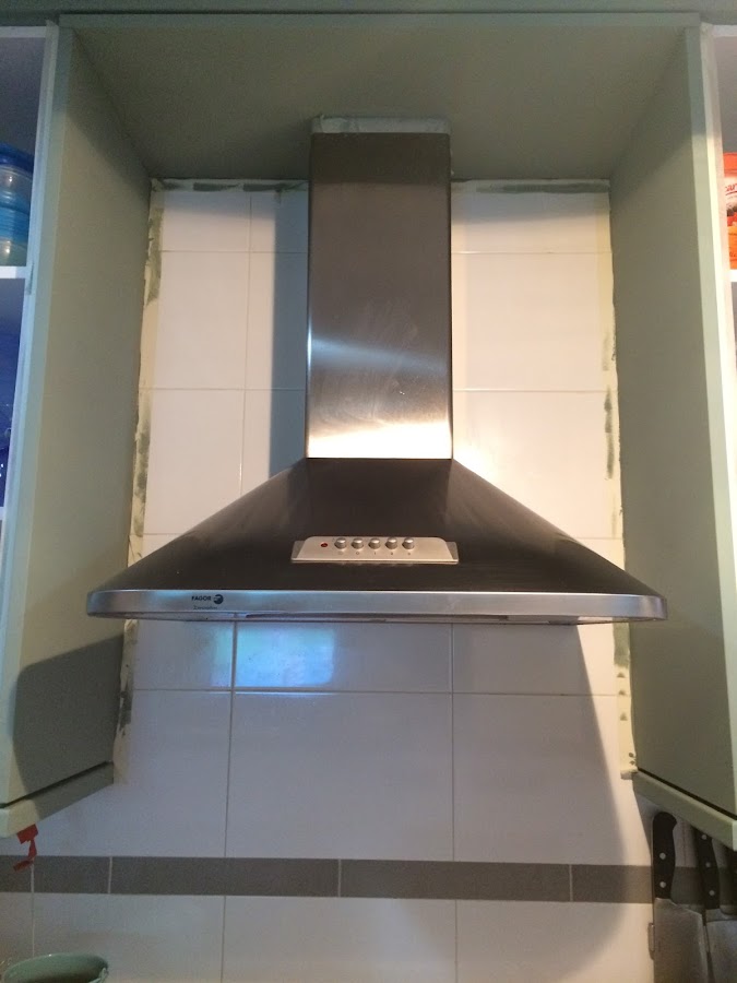 Lo primero que pinté fue el embellecedor que tengo arriba y abajo de los muebles superiores y la parte que rodea la campana extractora. Para ello me ayudé de un pincel. Tardé bastante, la verdad pero según se secaba y veía el resultado me animaba a seguir.