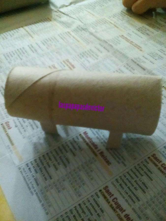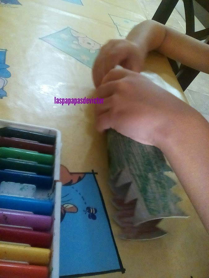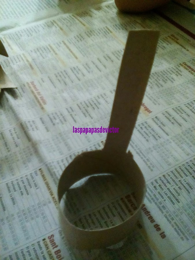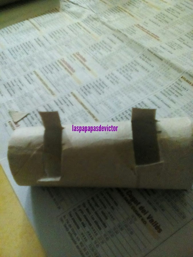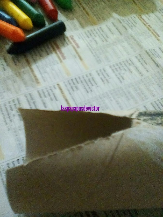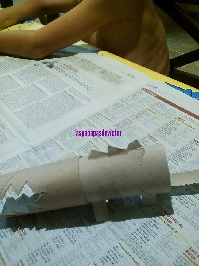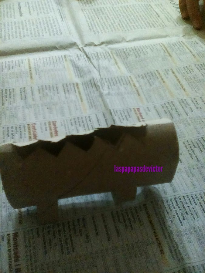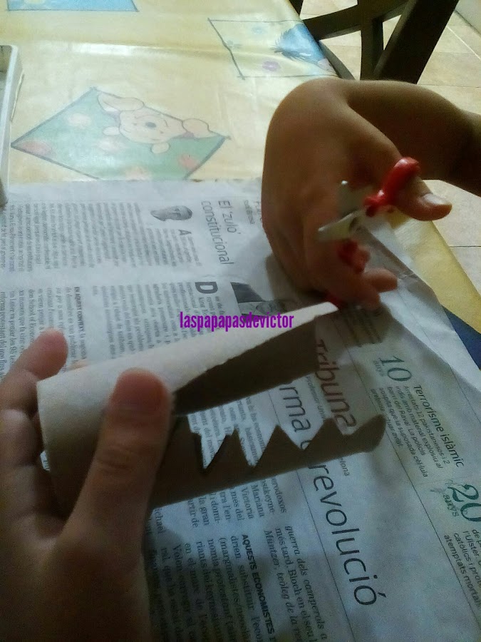 Chafais un rollo de papel y lo recortamos en diagonal hasta la mitad, y lo abrisaya que será la boca