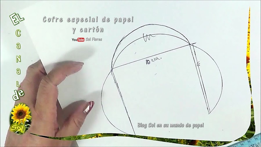 Para hacer el molde dibujé un cuadrado de 10 cm. por lado, luego con una tapadera, la colocamos en ambos bordes y marcamos, para la tapa marcamos arriba y como la quiero más alta marcamos hasta 4 cm., recortamos separando la tapa y pasamos dos veces al cartón,
