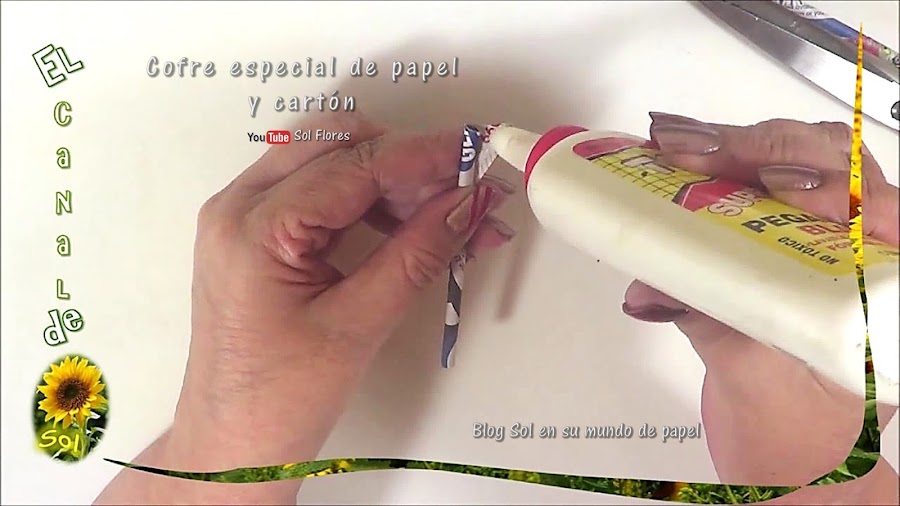 mientras secan y para hacer las varillas de papel yo corté la tercera parte de unos folletos, miden 8 centímetros y medio de ancho y enrollamos con una brocheta normal, cortamos la punta que siempre queda muy débil, medimos 10 cm. y cortamos, teniendo mucho cuidado en sostener la parte que se va a abrir y ponemos pegamento, yo prefiero hacerlo así en lugar de poner pegamento en toda la tira antes de enrollar,