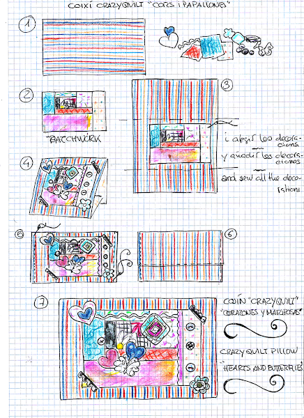 Primer, amb els retallsde tela, fem un crazy quilt, cosim com nosaltres vulguem, combinant segons el nostre gust (2). Després marquem el davanter del coixí, tenint en compte, que no s’ha de centrar, que s’han de deixar per la part del darrere un tros més llarg que l’altre i cosim el crazy quiltque hem fet, amb puntades decoratives (3); ara és el moment d’afegir totes les decoracions que vulguem, distribuint-les de la manera que més ens agradi. Pleguem (4), i cosim les costures laterals, pel davant amb una puntada decorativa, per formar el coixí (5); pel darrera, un plec a de quedar per damunt de l’altre, per poder ficar el farcit del coixí (6).