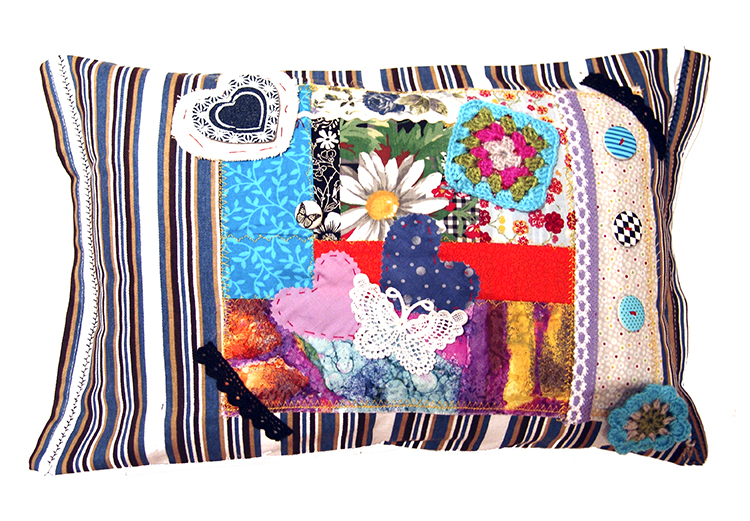 COJÍN CRAZY QUILT “CORAZONES Y MARIPOSAS”.