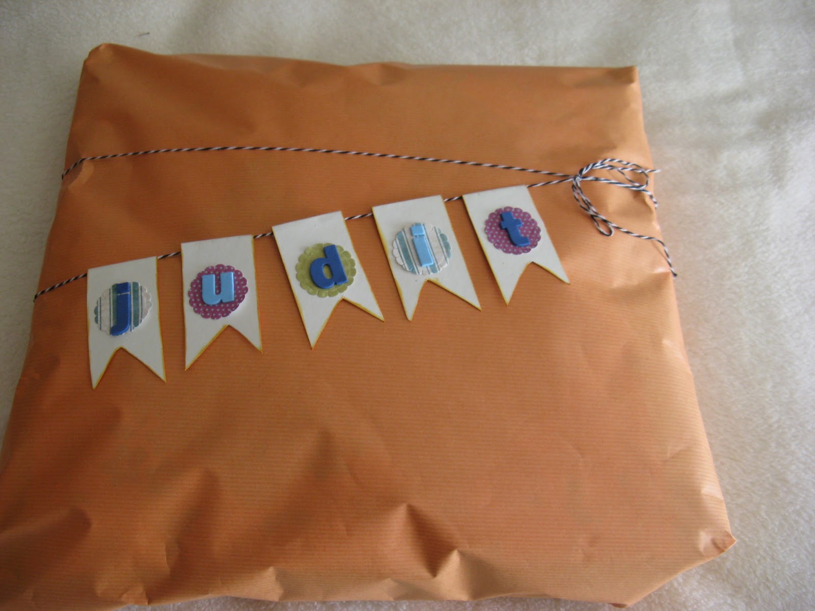 Per entregar-li li he fet una banderola amb el seu nom, ja que aixi ens quedaba un paquet més juvenil i el detall de la banderola li ha agradat tant com la manta.