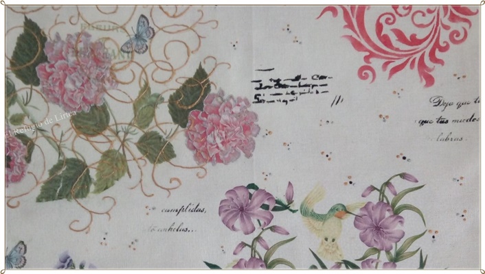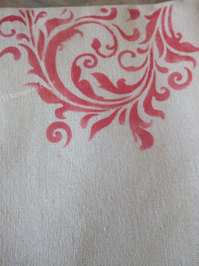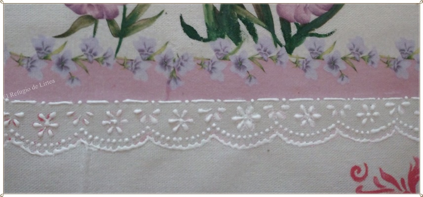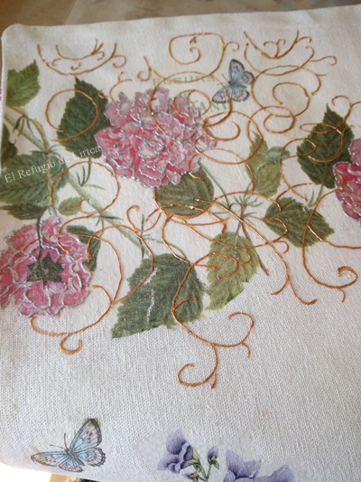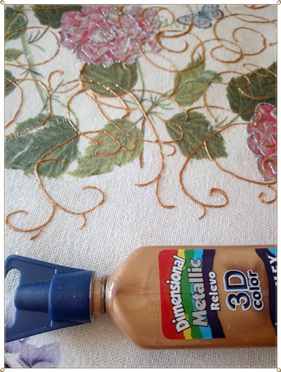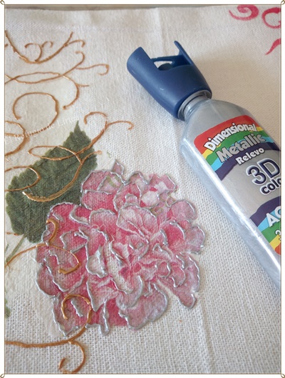 Dado que mi cojín no tiene solapa con cenefa como el del tutorial, hice los adornos con pintura en 3D sobre la imitación de cenefa que hice con la servilleta.