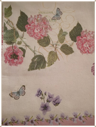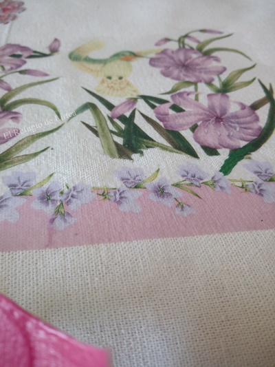 Para el dcoupage utilizo el medium o pegamento especial para tela, aplicamos una capa generosa sobre la tela y ponemos la servilleta, dando otra capa generosa del mismo medium sobre ella.