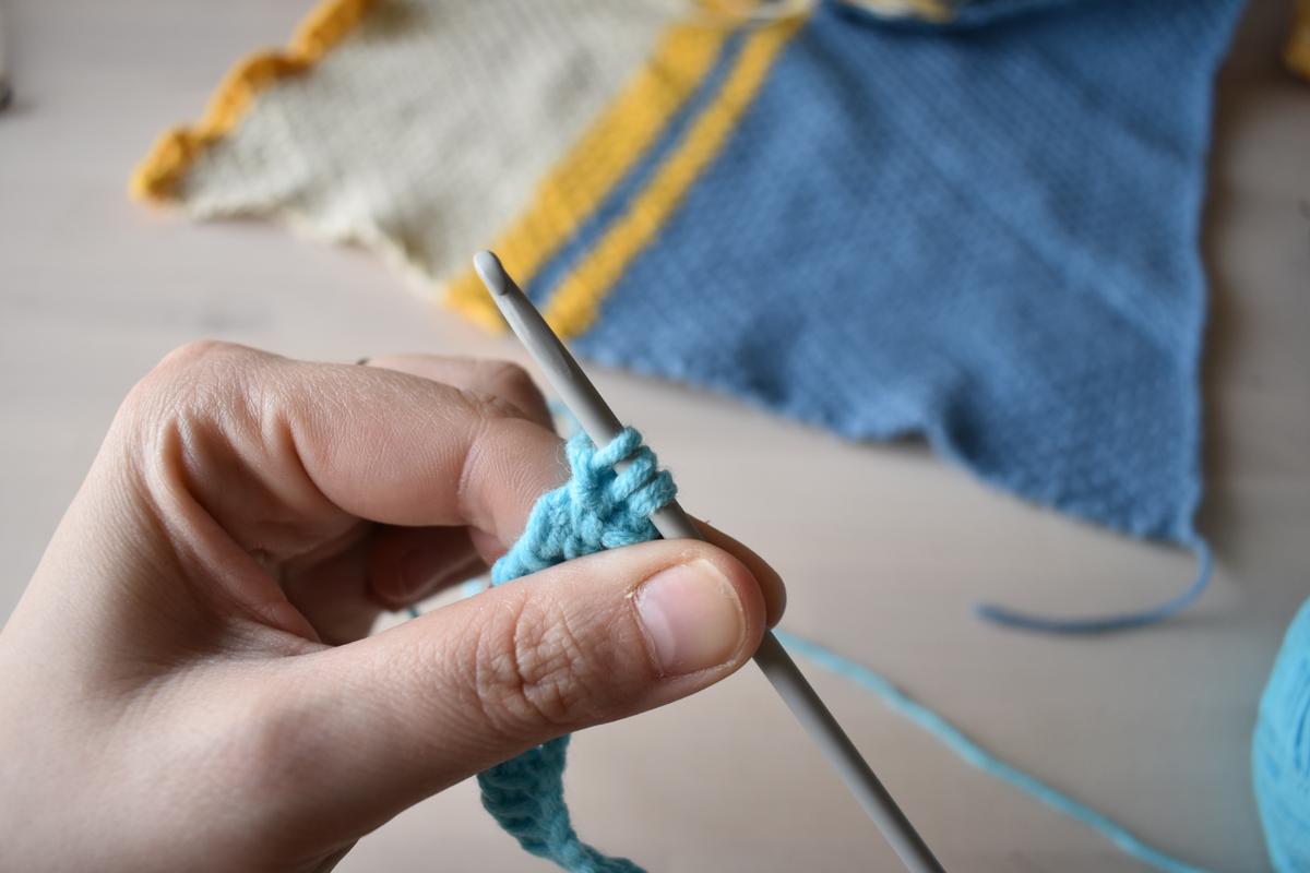 V2: Si te fijas, tendrás una serie de palitos, que son cada punto de la vuelta. Pasa la aguja por el primer palito, coge hilo y pásalo (este es el punto del derecho) el segundo lo harás del revés, para ello, coge el hilo con la aguja, pasa la aguja por el segundo palito, pasa el hilo por delante y coge hilo y pásalo. Sigue haciendo uno del derecho y del revés hasta llegar al final.