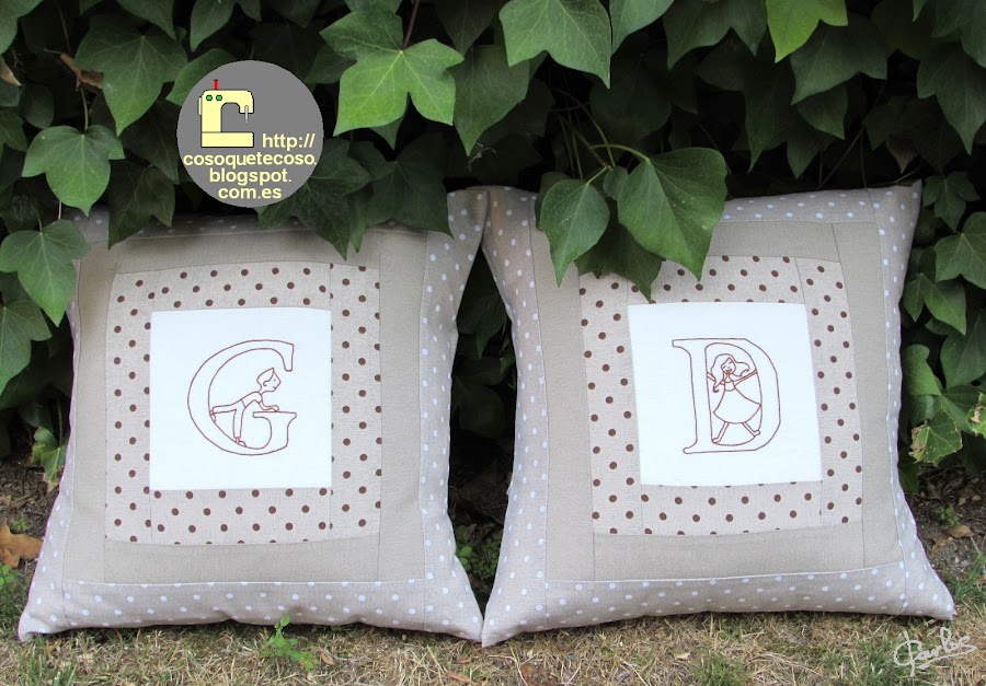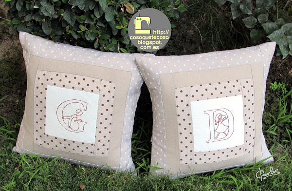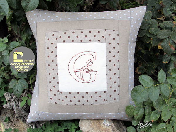 Pues bien, ya la he llevado a cabo en un cojín, aquí el primer plano de la letra bordada a mano: