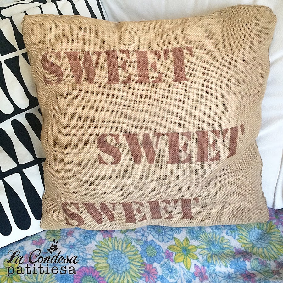 Con todo esto y una vez cortada la arpillera al tamaño necesario nos vamos al ordenador, necesitamos imprimir la palabra o la frase que queremos escribir en nuestro cojín, en mi caso SWEET. Elige bien el tamaño porque vamos a crear una plantilla que nos sirva para pintar las letras sobre la tela.