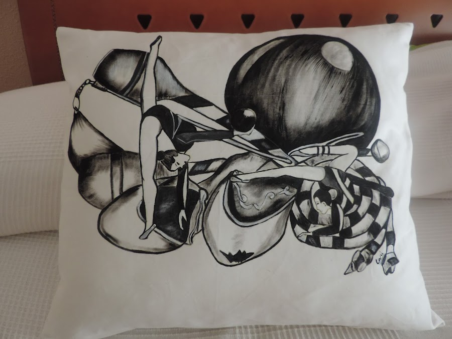 Este cojín de gimnasia rítmica, mide 48 x 45 cm, más o menos, está pintado a mano sobre tela de algodón, con pintura para tela, de la marca seta color, y los únicos colores que he utilizado han sido el blanco y el negro. Le he puesto un relleno de cojín de 50 x 50 cm, para que quede más llenito.