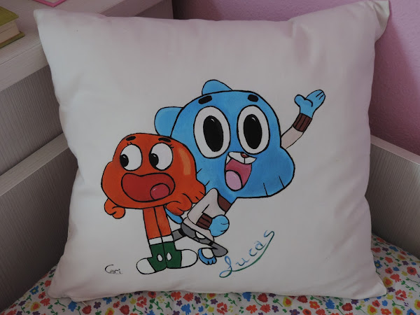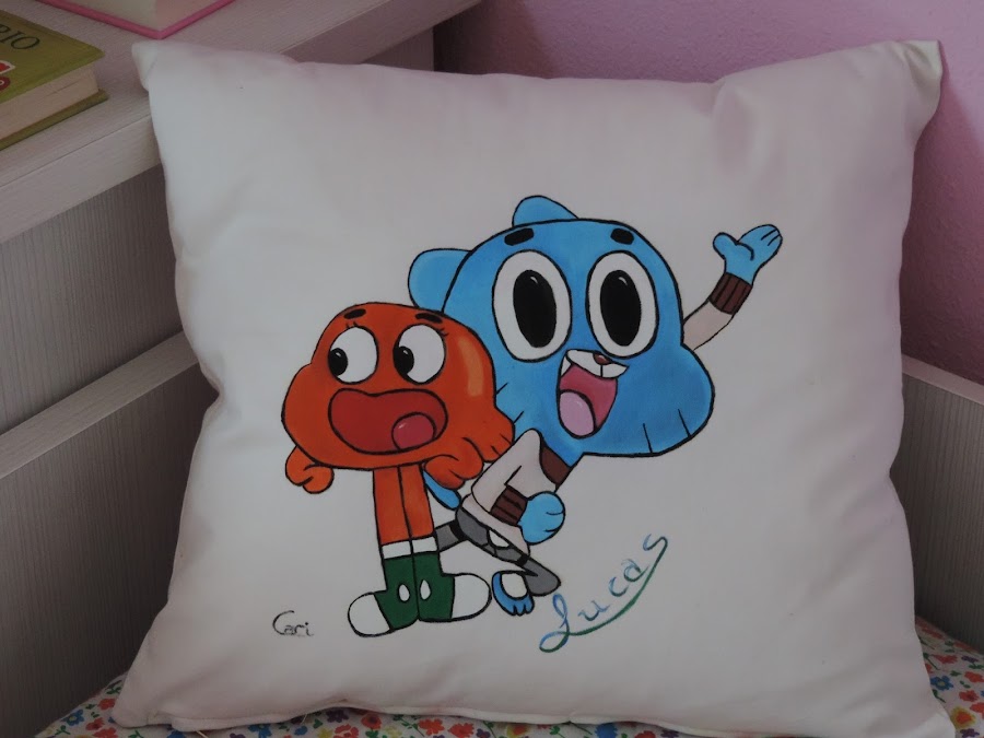 El cojín es de los dibujos del Asombroso mundo de Gumball, y los personajes del cojín son Gumball y Darwin. Gumball es el azul y Darwin es el naranja.