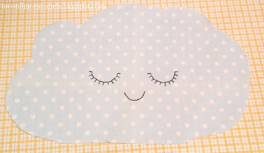 Dibujamos los ojitos cerrados con las pestañas, y la boca sonriente, para guiarnos a la hora de bordarlos (en la foto, con la luz, no se ve bien, pero están dibujados), y comenzamos a bordar en bastidor.