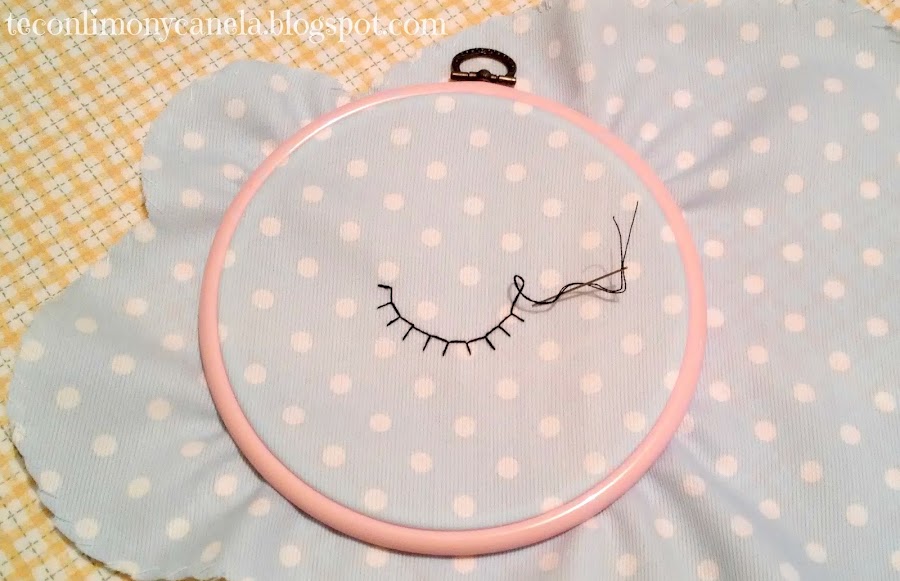 Dibujamos los ojitos cerrados con las pestañas, y la boca sonriente, para guiarnos a la hora de bordarlos (en la foto, con la luz, no se ve bien, pero están dibujados), y comenzamos a bordar en bastidor.