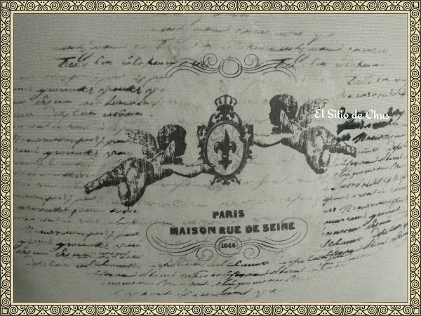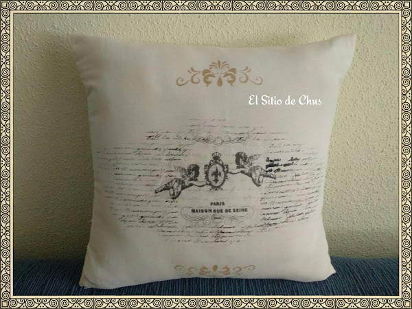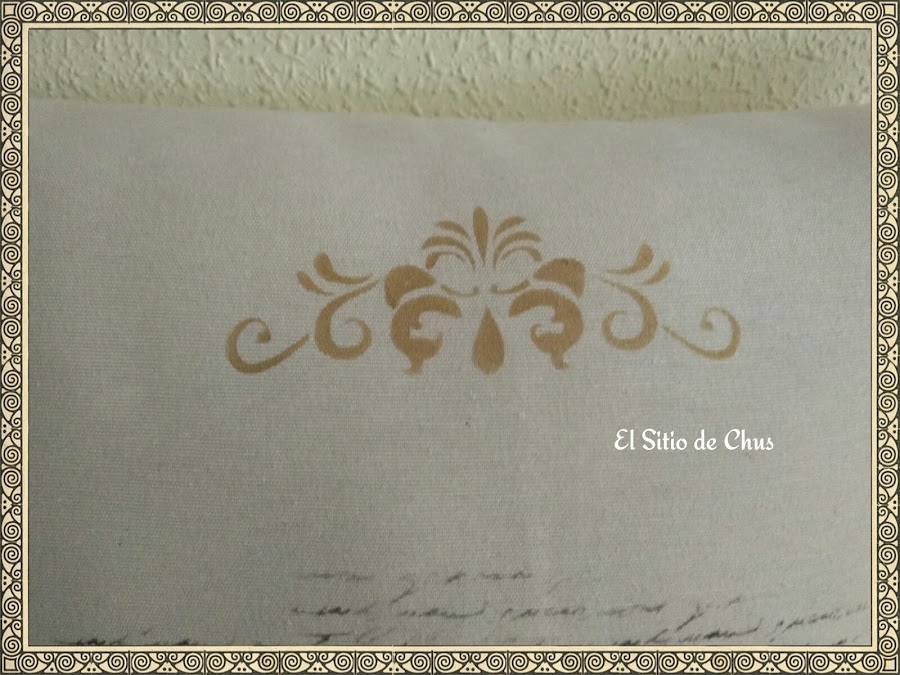 Para integrar la servilleta en el cojín, estarcí esas letras cursivas que tanto me gustan. En la parte derecha hay un fallo grande provocado por no secar bien el pincel.... (De los errores se aprende!)