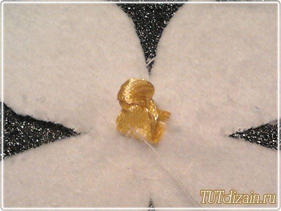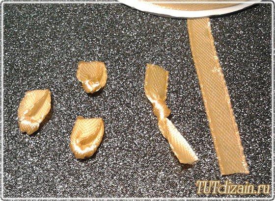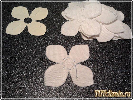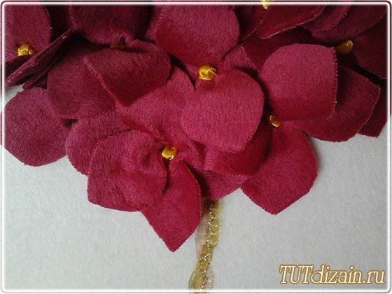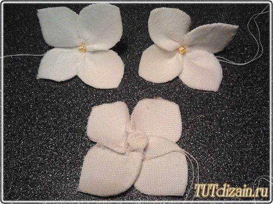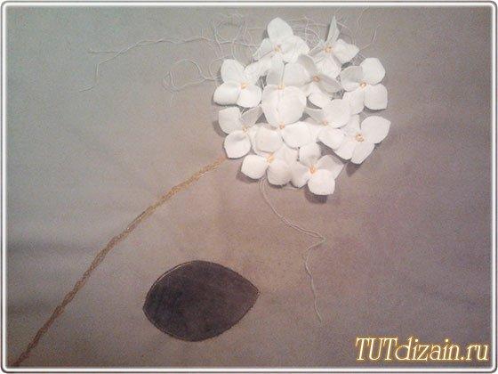 De una cinta de raso delgada hagamos los centros para las flores de hortensia.