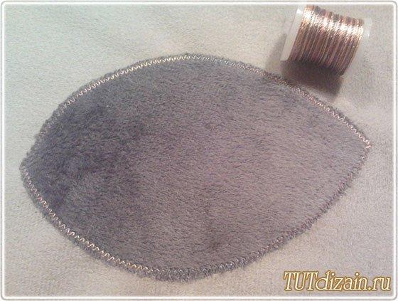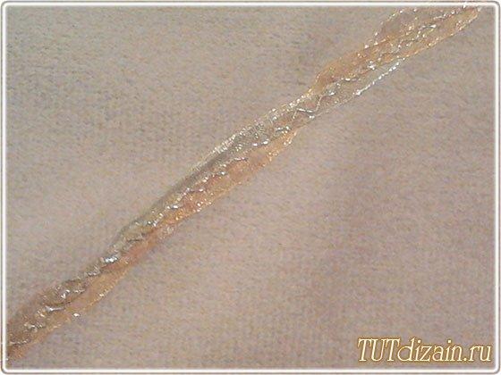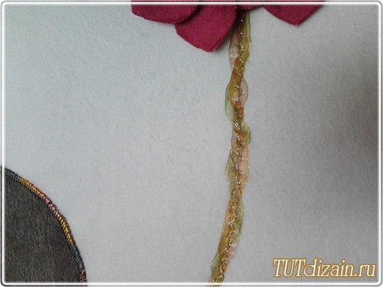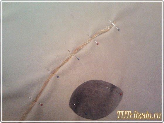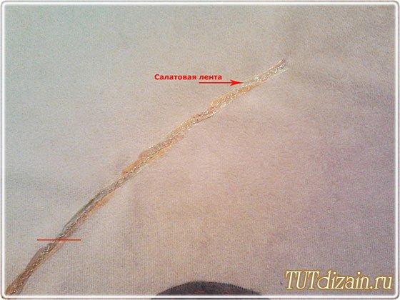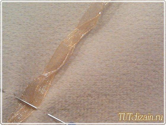 De una cinta delgada vamos a hacer el tallo para nuestra hortensia. Primero acomodemos la cinta con los alfileres (la vamos a torcer un poco) y luego la cosemos a la funda.
