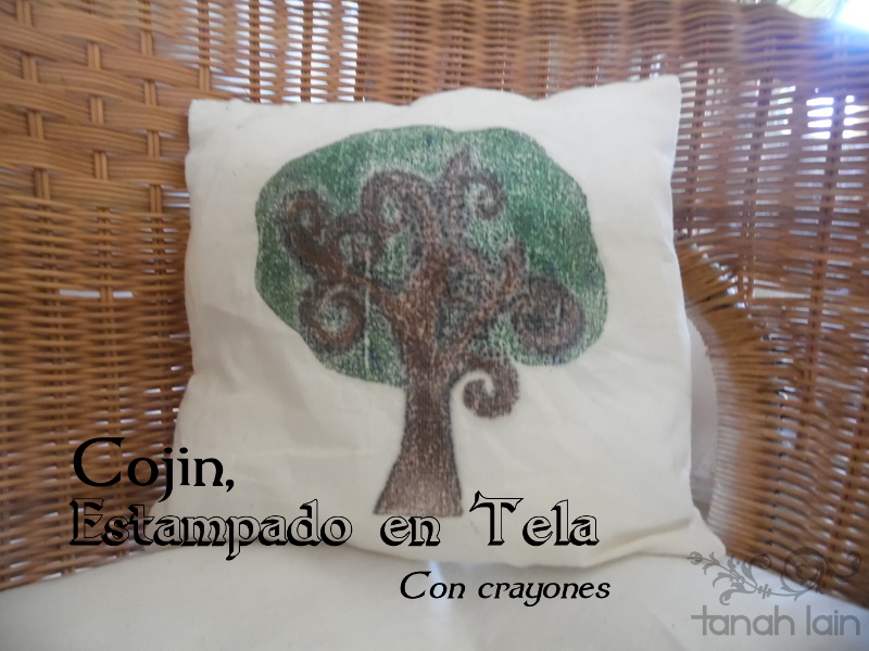 Lo siguiente fue colorear con los crayones el árbol, tiene que quedar bien firme el color. Yo recorte la silueta de la lija. También recorte un rectángulo en la tela, el mío fue un cojín pequeño de 25 x 26 cm.