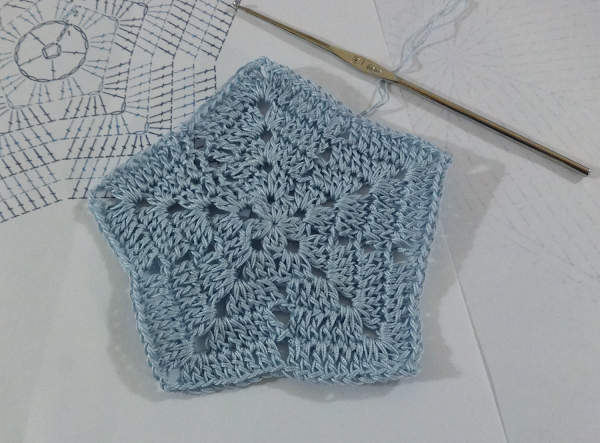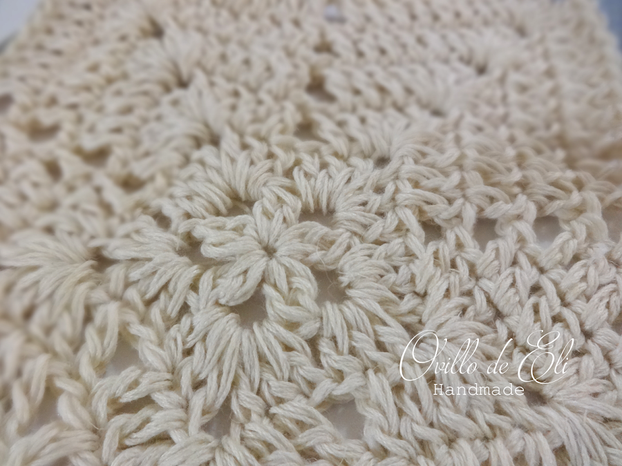 Inicié a tejer con hilo de algodón en color beige y gancho no. 5, este hilo no tenia indicaciones de grosor o características cuando lo compré, pero estimo que es un no. 2 y tejí a 3 hilos, este es el resultado con la flor central igual al modelo