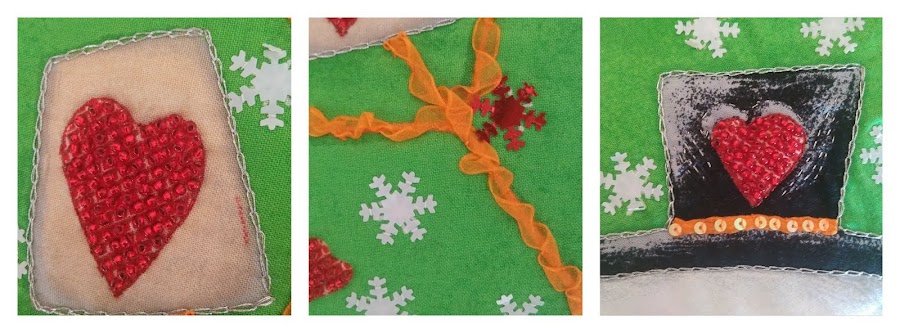 Decidí que iba a hacer cojines navideños con la tela. Utilicé la misma técnica que en el calcetín navideño, acolchado y bordado a mano con hilos, hilos metalizados, pedrería para costura, pasamanería y lazos.