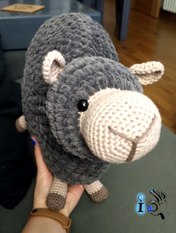 Yo me enamoré de este cojin hace muchísimo tiempo, hace años de hecho, cuándo Gallimelmas lo sacó, pero sólo lo enseñaba en los talleres y yo no pude ir a ninguno. Luego sacó un kit con el patrón y la lana que hacía falta para hacer la oveja del color que quisieras (bueno, y los ojos, la aguja lanera y eso), y ahí ya no lo dejé más y lo compré incluso en preventa. Pero de eso hace más de un año y aún no había sacado tiempo de hacerlo. Y ahora que al fin lo he hecho no puedo estar más encantada.. Os enseño varias fotos para que se luzca, que tiene hasta rabito (ji ji ji, me hizo mucha gracia) y también una en la que la sostengo para que veais el tamaño.