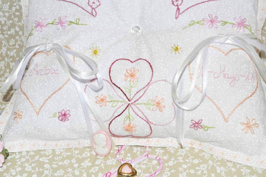 Y aquí la parte inferior del cojin donde estan dentro de otros dos corazones el lugar del enlace y la fecha además de otros adornos.