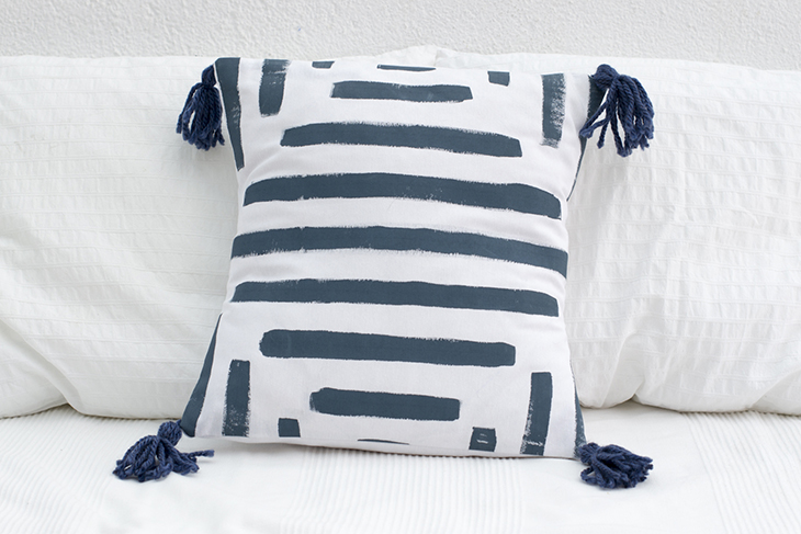 Este DIY se puede hacer con tela nueva para que nosotros cosamos el cojín, o bien para customizar un cojín liso que ya tengamos. En mi caso, como tenía restos de boneta blanca, desempolvé la máquina de coser que no usaba desde hacía meses y me puse a coserlo usando la técnica de sin cremallera que os expliqué en este otro cojín DIY
