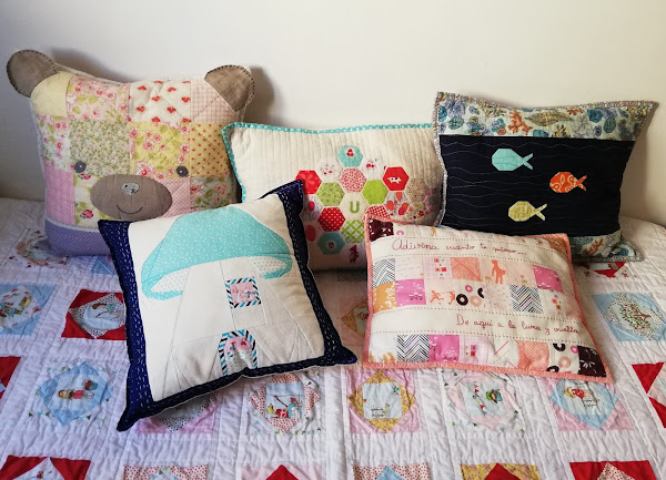 Y su cama llena de cosas hechas por mí. Un quilt y unos cuantos cojines.