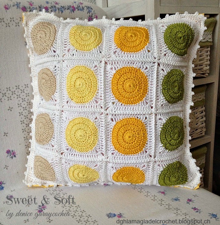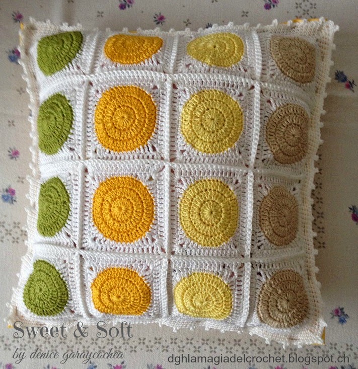 6.- unimos los grannys con punto bajo, cuando ya tenemos todos unidos, tejemos alrededor 5 filas de medios puntos, si se desea hacer ambas caras del cojin en crochet se repite la operación para la otra cara, pero si deseamos poner tela del otro lado cosemos a maquina o a mano.