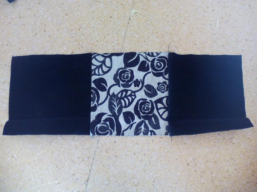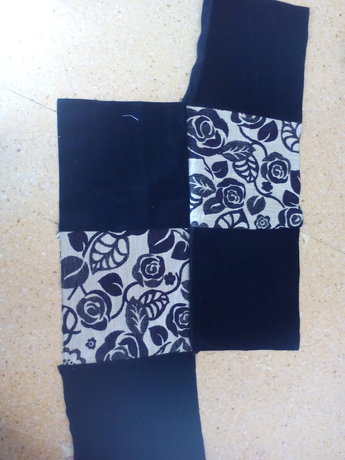 3. Los cosemos de tres en tres como ves en la foto. (Liso a los lados y estampado en el centro).