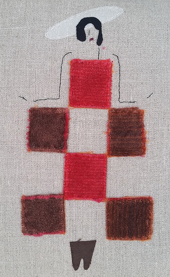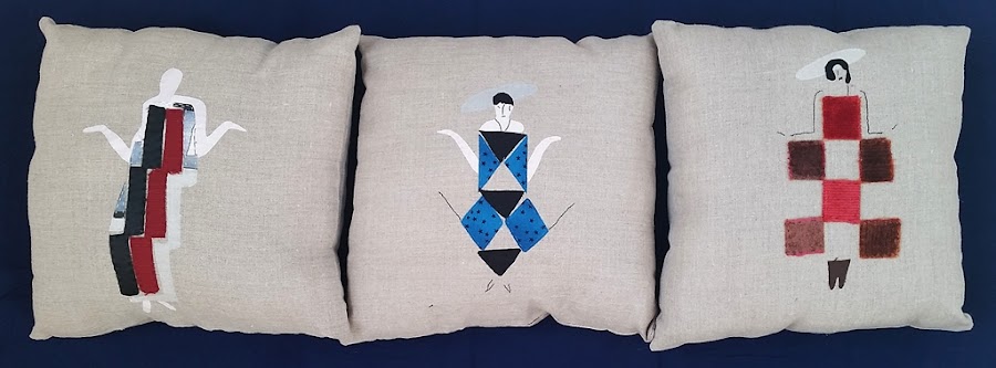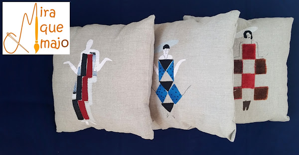 Investigué sobre ella y trabajé en varias ideas, y hoy os enseño unos cojines que hice adaptando a mis gustos algunos de sus diseños de ropa. Son unas piezas aplicadas que quedaron chulísimas.