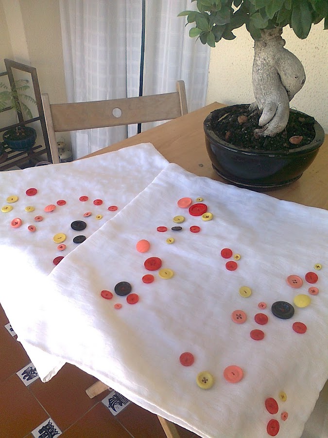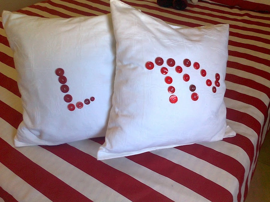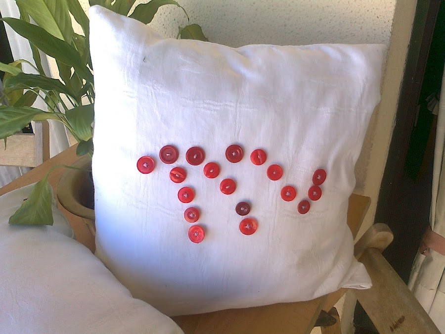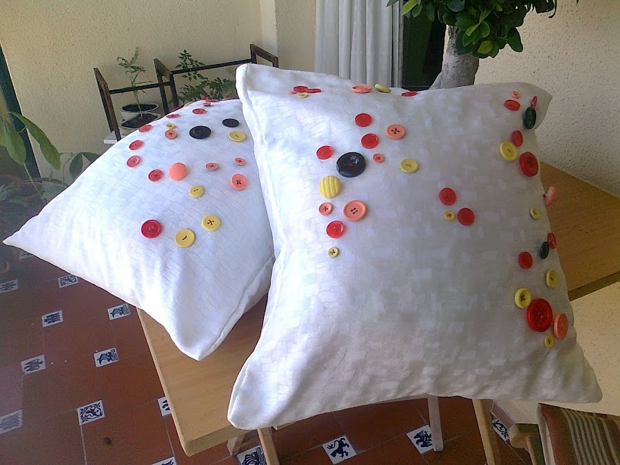 Los botones de la abuela estaban en una caja desde hace muchos años sin que salieran a respirar, así que con laca de uñas y un poco de imaginación les di el toco distinto a los cojines. A mi me han gustado mucho como quedaron.