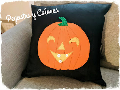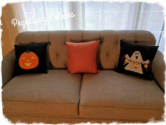 Si ya se... cojines otras vez? Pues digamos que me he hecho muy aficionada de los susodichos adhesivos para tela, jajaja! Y me gusta estar cambiando la decoración de la casa de acuerdo a la temporada. Mis fundas de los Cojines de Otoño, están en la sala y ahi seguiran hasta que sea hora de decorar para Navidad. Pero tengo un sofá en el recibidor, y ahí es donde tengo casi toda la decoración de Halloween, mas la que esta afuera. Le hacia falta algo mas a ese rincón... mas después de haber visto unos cojines de Halloween preciosos en las tiendas, dije guau! Pero luego vi el precio y dije...auch! Jajaja! Y como tenia el material pues me decidí a hacerlos yo misma. Si se cuenta ya con restos de telas de colores, es muy fácil hacer proyectos de estos y no tener que pagar una fortuna para cambiar la decoración.