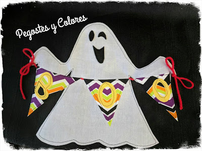 7.- Enseguida con una aguja estambrera, meti un lazo de estambre para que simule que el fantasma sujeta su guirnalda. A la calabaza le cosi a mano unos botones blancos como si fueran dientes.