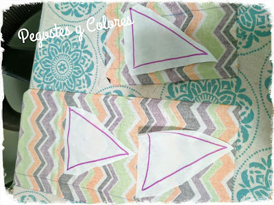 2.- Elijo las telas que corresponden a cada pieza y plancho por el lado del revés de la tela el papel con el lado pegajoso sobre la tela y colocando encima un pañuelo como protector para la plancha. Es importante leer las instrucciones sobre cuanto tiempo y temperatura requiere, eso depende de la marca. En mi caso requiere de temperatura media sin vapor durante un tiempo de 2 segundos.