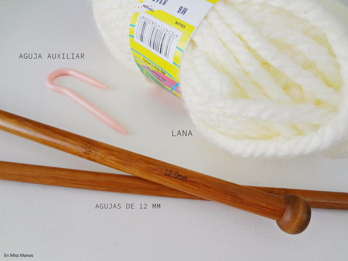 Para tejer la parte delantera me hicieron faltan 2 ovillos de lana gordita, unas agujas de 12 mm y una aguja auxiliar para hacer las trenzas.