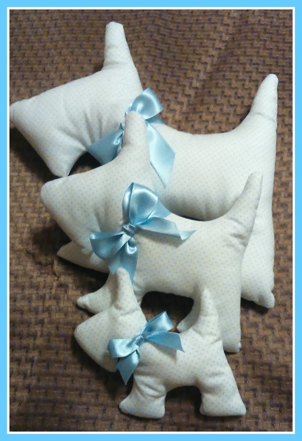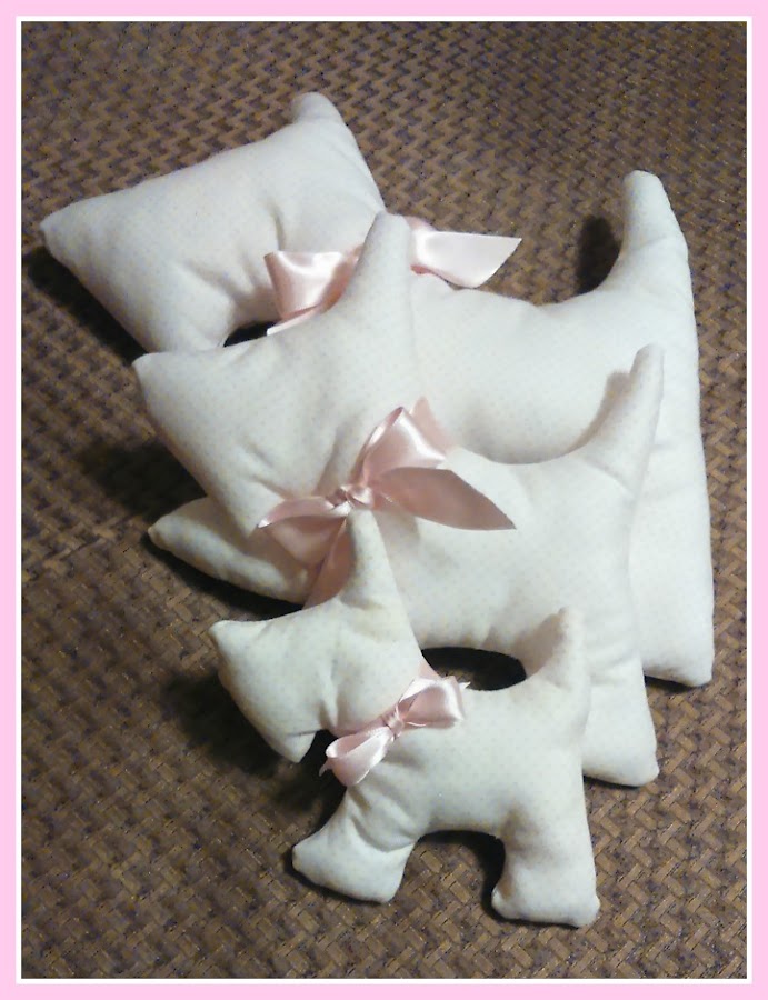 El perrito mayor es un cojín sin más, el mediano tiene un bolsillo en la panza, para guardar el chupete por ejemplo y el más pequeñito lleva un cascabel para usarlo de sonajero.