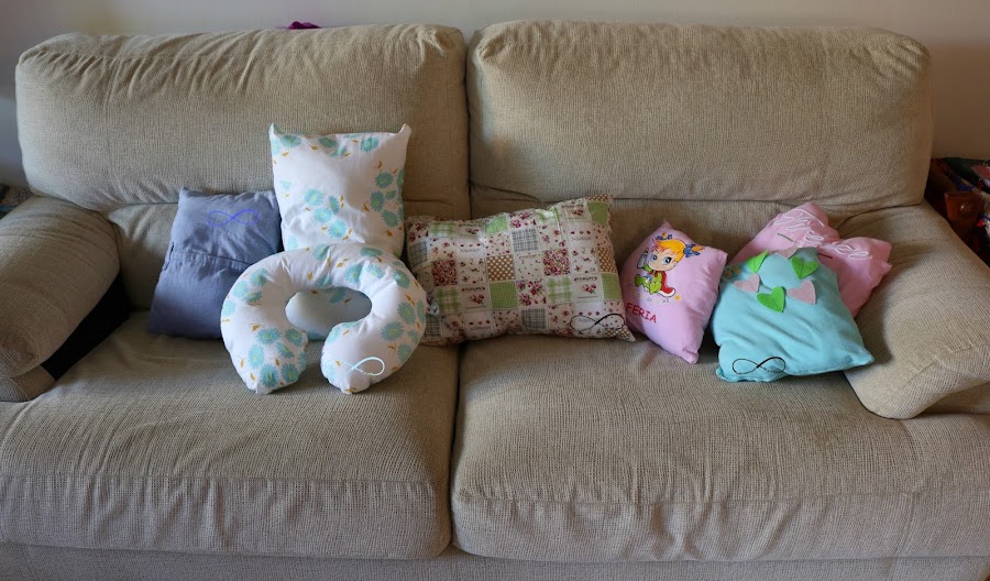 Mi exposición de cojines...ummm aunque me dejé uno que hice al principio de iniciarme en la costura con máquina de coser, en tamaño XL.