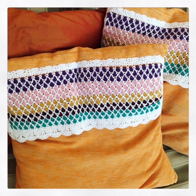 Podéis utilizar las combinaciones de colores que os apetezcan, incluso un solo color sobre el fondo blanco quedará ideal. Para rematar hice una puntilla clásica alrededor, y ahora estoy feliz estrenando cojines.