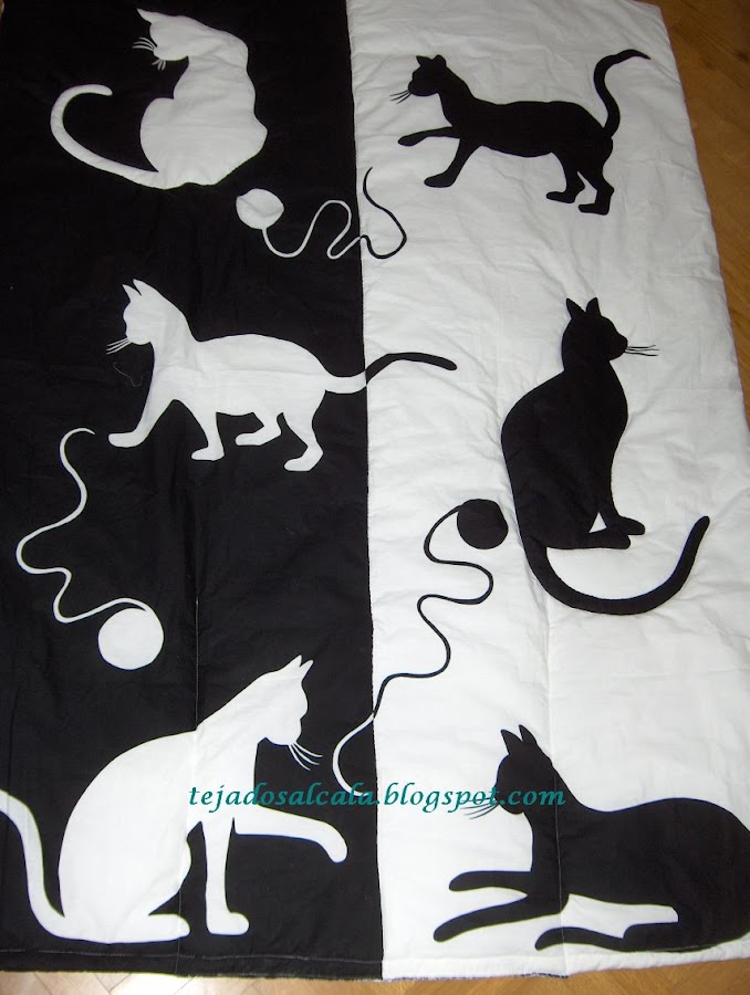 La manta la he hecho con una tela con gatos en blanco y negro y acolche la silueta de los gatos, la otra parte se me olvidó hacerle foto, pero eran gatos pequeñitos en blanco y negro.