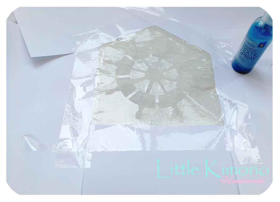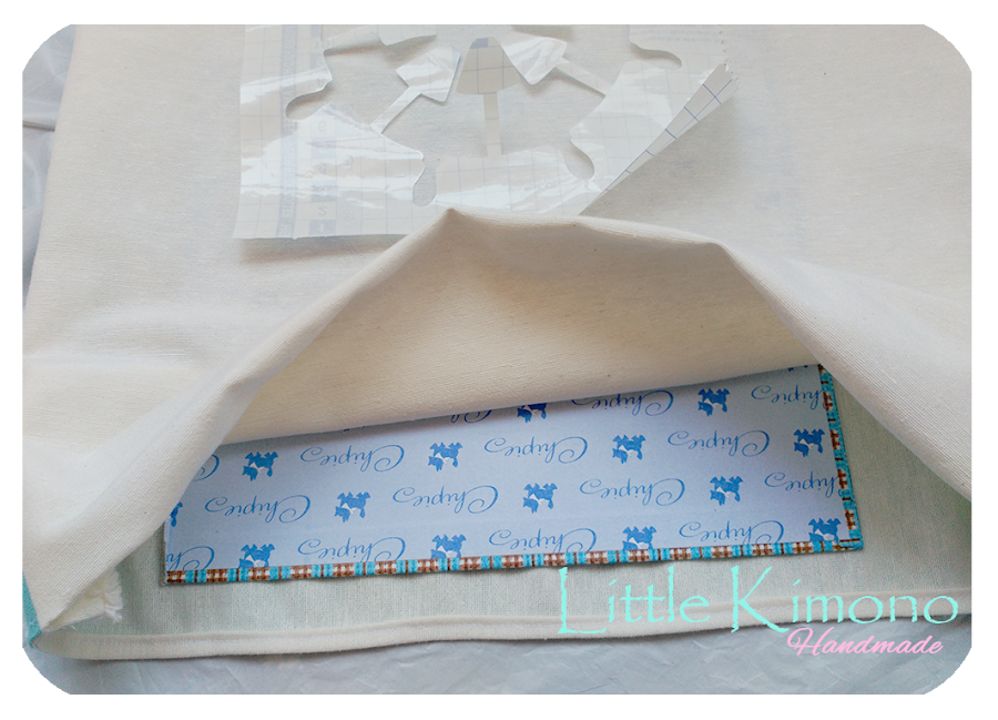 2. Una vez tengamos la plantilla, quitaremos el papel protector del film y colocaremos la plantilla sobre la tela. Muy importante, colocaremos un cartón debajo de la tela para que no traspase la pintura a la otra capa de tela ;)