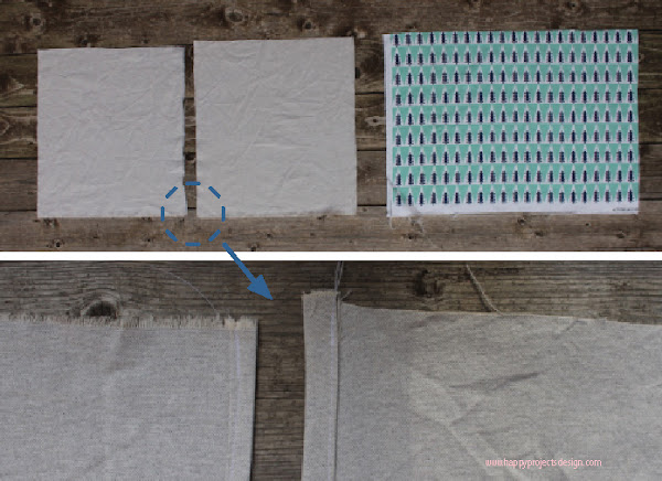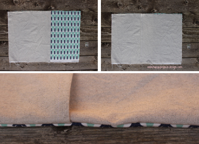 5. Coloca la tela delantera boca arriba y sitúa encima los dos trozos de la parte posterior. Las partes buenas de la tela deben estar encaradas y el dobladillo que acabas de hacer en el centro.