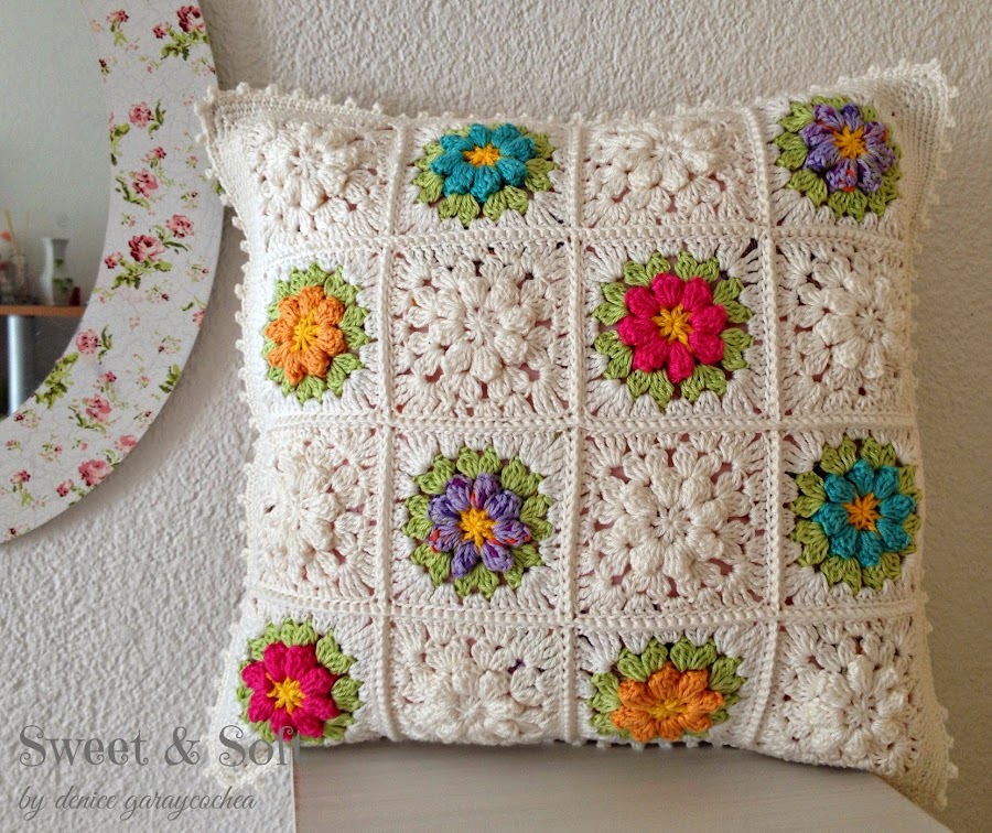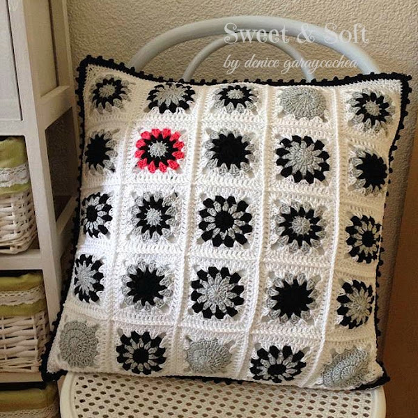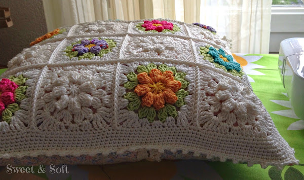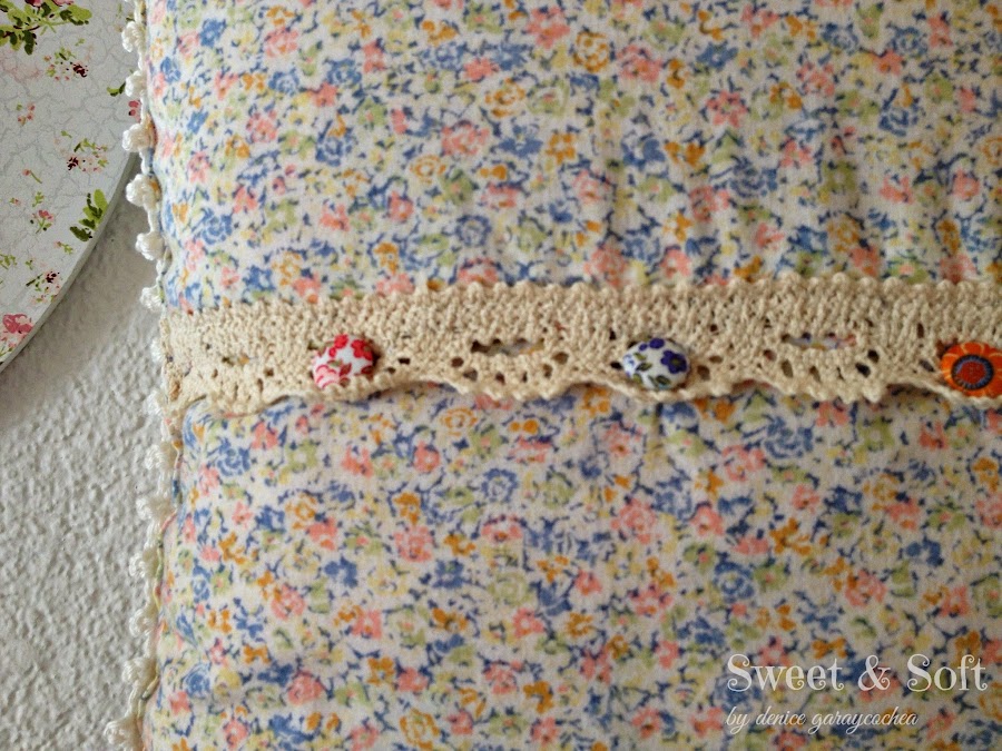 Este Cojín me encanta me ha salido con un aire muy romántico y creo que éste lo reservaré para mi rincón preferido. Los bordes los he hecho en punto picot, el modelo lo pueden ver en Dada"s Place, allí encontrarán el turorial, está en inglés pero con las fotos es muy fácil de hacerlos.