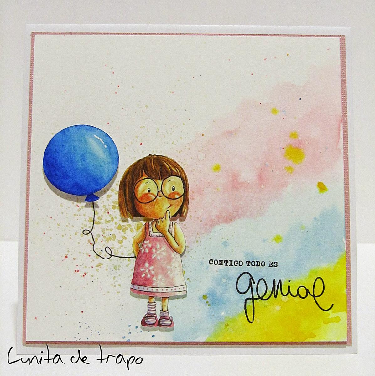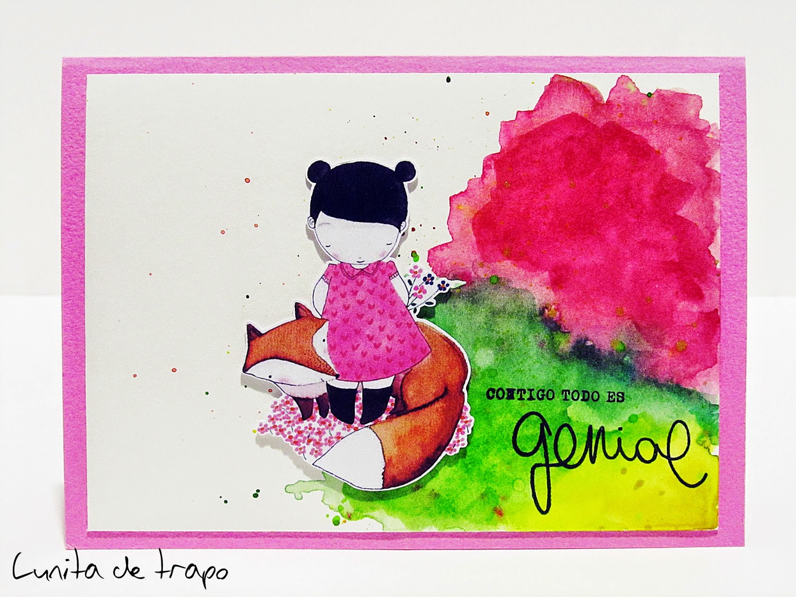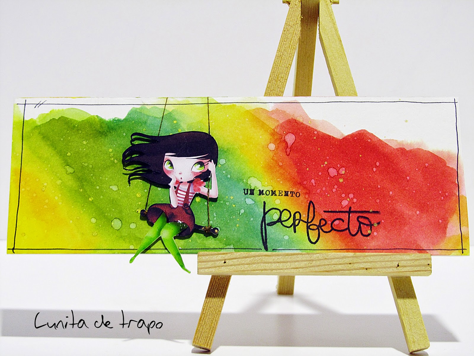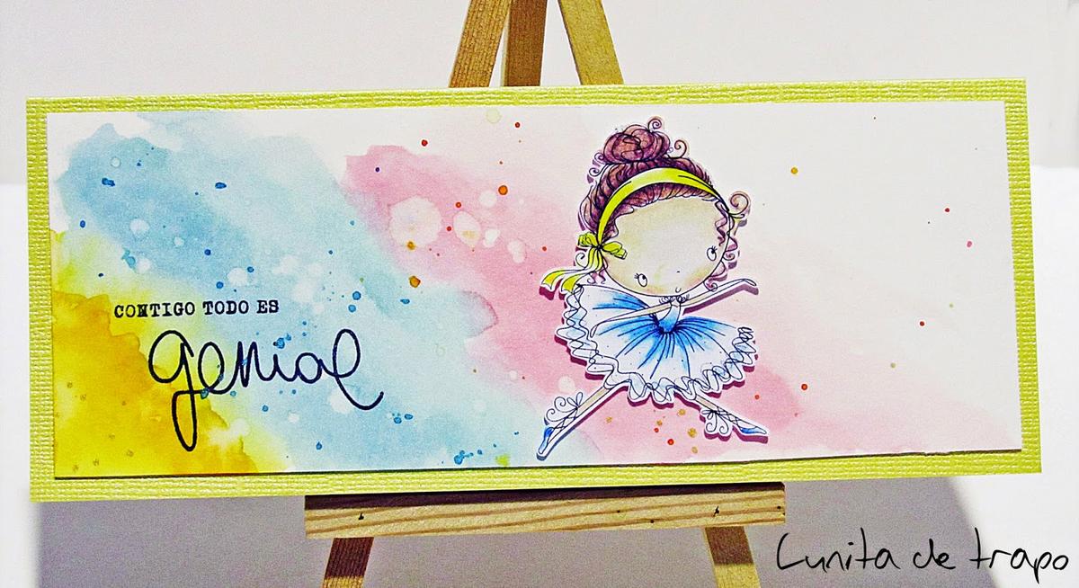 Una vez hechas me dije voy a cambiar de registro y voy a hacer algo diferente menos dulce ni tan bebé y recordé las acuarelas profesionales que me había regalado una gran amiga, las nuevas tintas de Heidi swapp que me he comprado y todos los tutoriales de Youtube sobre Art journal que he estado viendo últimamente y me dije porqué no, vamos a probar, corté la tarjeta pero me dije primero voy a probar en restos de papel de acuarela haber que tal queda y como me gustó tanto el efecto hice la tarjeta y esta es: