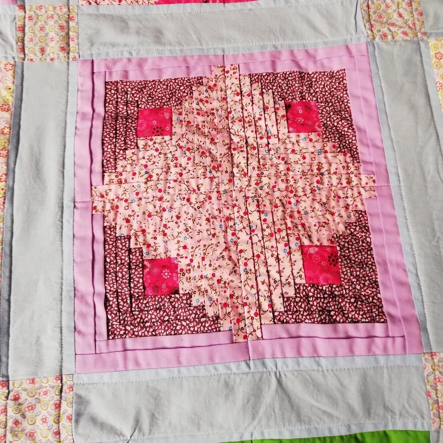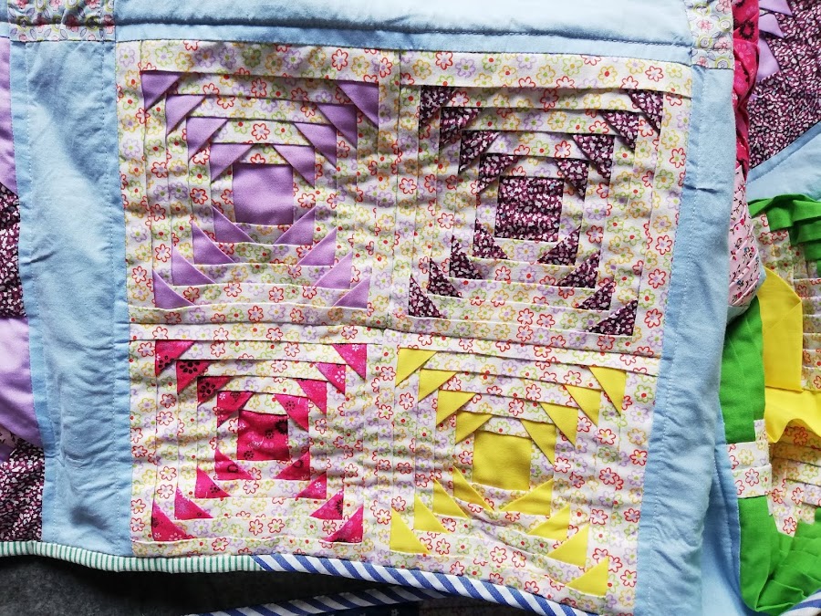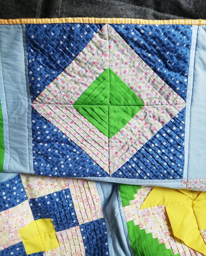 Como cada bloque está cosido sobre una pieza de tela, el top tenía un peso considerable, así que para aligerar un poco el peso final decidí no usar relleno y usar una manta polar como trasera. Para el acolchado me decidí por coser una linea a cada lado de cada bloque para que quedase una cuadrícula.