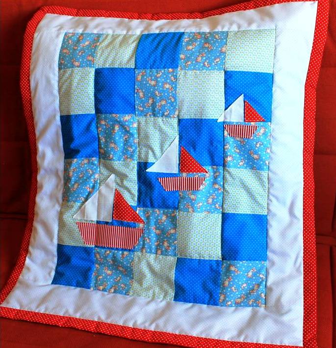 Como veis, esta hecha a base de cuadraditos unidos entre si, y el acolchado es simple. Lo de los barquitos como aplicación es porque los papis son los dos de navales, así que me ha venido bien, porque los barquitos son fáciles de hacer. :-)
