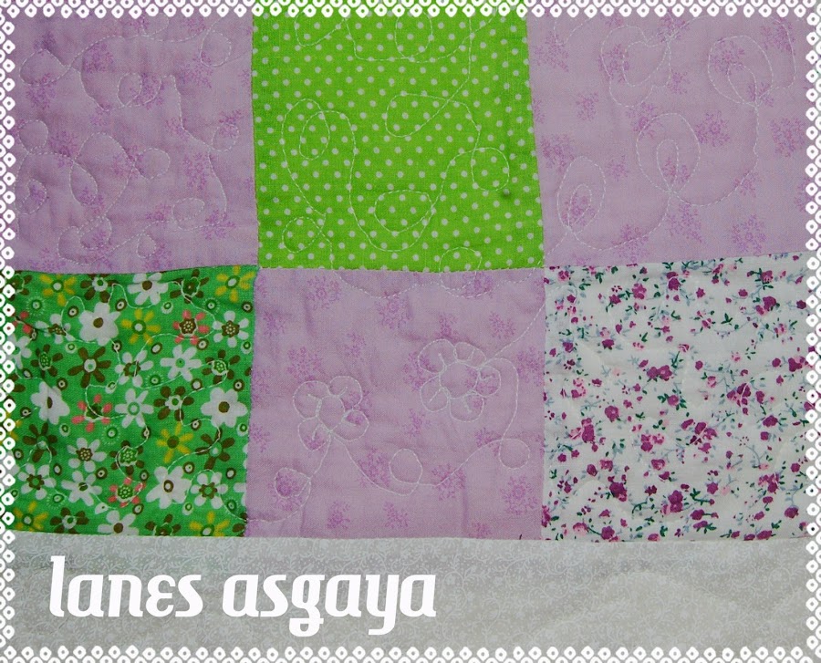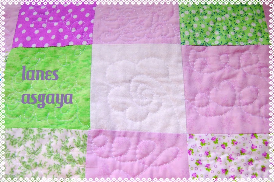 Había oído hablar del acolchado a máquina (porque acolchar a mano, ni loca lo iba a hacer) y me apunté a un curso de un día que dio Jacqueline Bahí en Gijón. Me encantó y me propuse acolchar mi colcha con la máquina. Cuando me puse a practicar lo que habíamos aprendido aquel día, me di cuenta que acolchar bien me iba a llevar muuuuuuucho más tiempo de lo que yo había calculado, y como por desgracia tiempo es algo que no me sobra, practiqué con 3 sandwichs (tela+guata+tela) y me lancé a lo que saliera. ¿Quién dijo miedo?
