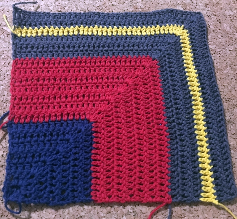 Vuelta 18: Cambiamos a color amarillo. 3 pcad, 1 pa en cada punto de la vuelta anterior, (2 pa, 2 pcad, 2 pa en la esquina), 1 pa en cada punto de la vuelta anterior. En esta vuelta no giramos. Rematamos y cortamos el hilo amarillo en el último punto, y vamos a retomar el hilo gris que dejamos en la vuelta anterior para hacer la siguiente.