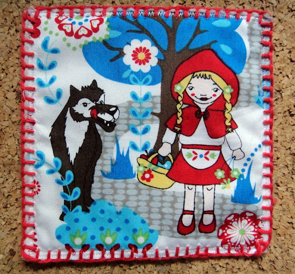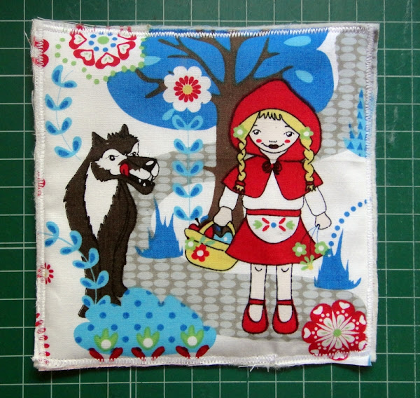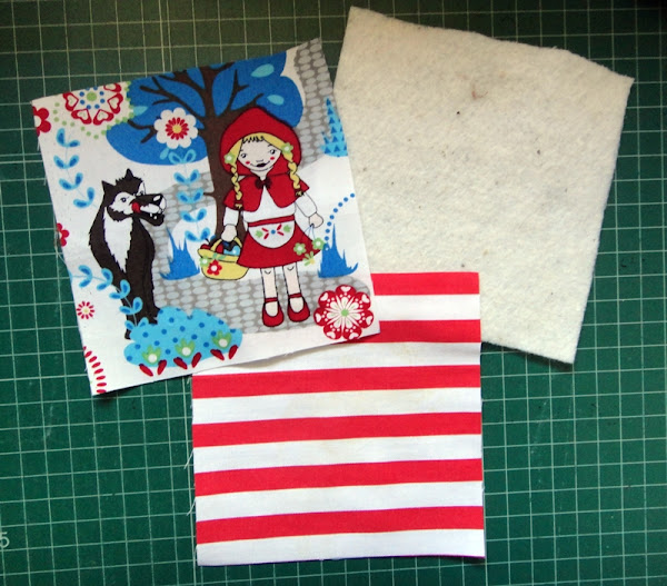 Vamos a cortar un cuadrado de tela de Caperucita de 12x12 cm, otro igual con otra tela que os guste para la trasera (yo he usado esta tela de rayas) y una pieza de guata de la misma medida. Las telas son de algodón tipo patchwork.