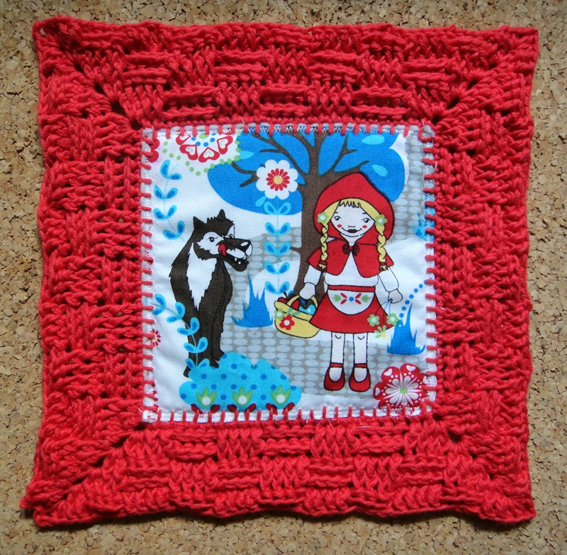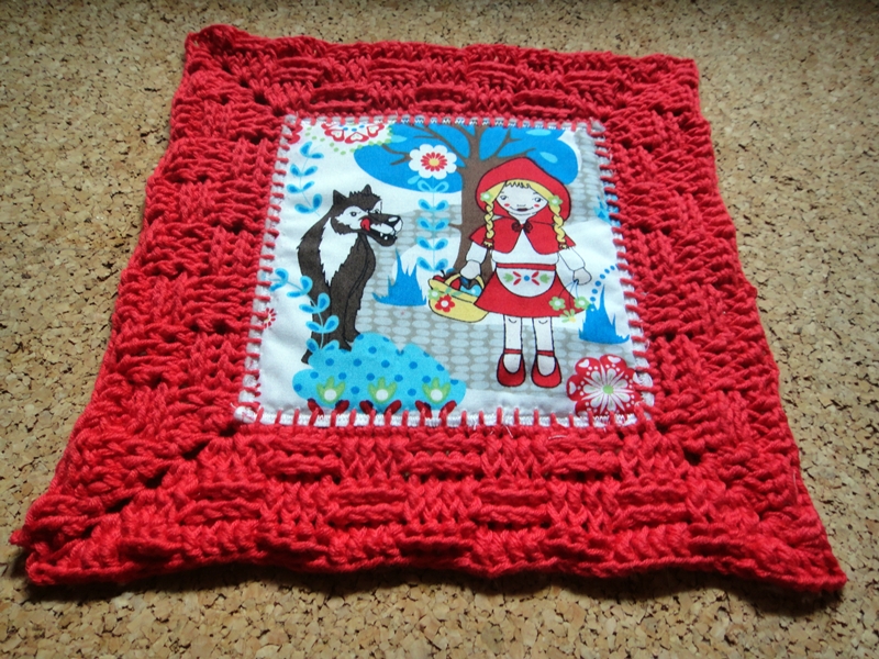 Es muy posible que no tengáis en casa una tela de Caperucita que podáis aprovechar para hacer este bloque. Podéis sustituirla por una tela con estampado floral que os guste (una tipo Liberty puede quedar muy bien), o con un estampado de cestas, o simplemente hacer un bloque con punto Basket Weave sencillo trabajado en plano sin necesidad de hacer esquinas. Si elegís esta última opción, recordad que el bloque tiene que medir 20x20 cm al final, para ser igual que el resto de bloques de la colcha.