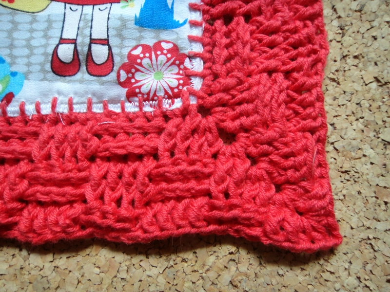 Ahora vamos a la parte divertida de ganchillo. He elegido este punto que parece el entramado de una cesta (por lo de la cesta de Caperucita). Se llama Basket Weave y es muy divertido de hacer. Pinchando en el enlace tenéis una explicación de como se hace en un cuadro plano. La complicación del nuestro es que tenemos que trabajar formando esquinas.