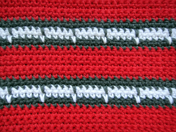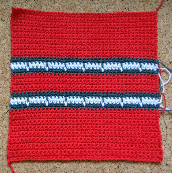 Vueltas 29 a 34: Hacemos lo mismo que en las vueltas 17 a 22, retomando los hilos gris y blanco que habíamos dejado atrás. En la vuelta 34 cambiamos al hilo rojo en el último pcad. Ya podemos rematar y cortar el gris y el blanco.